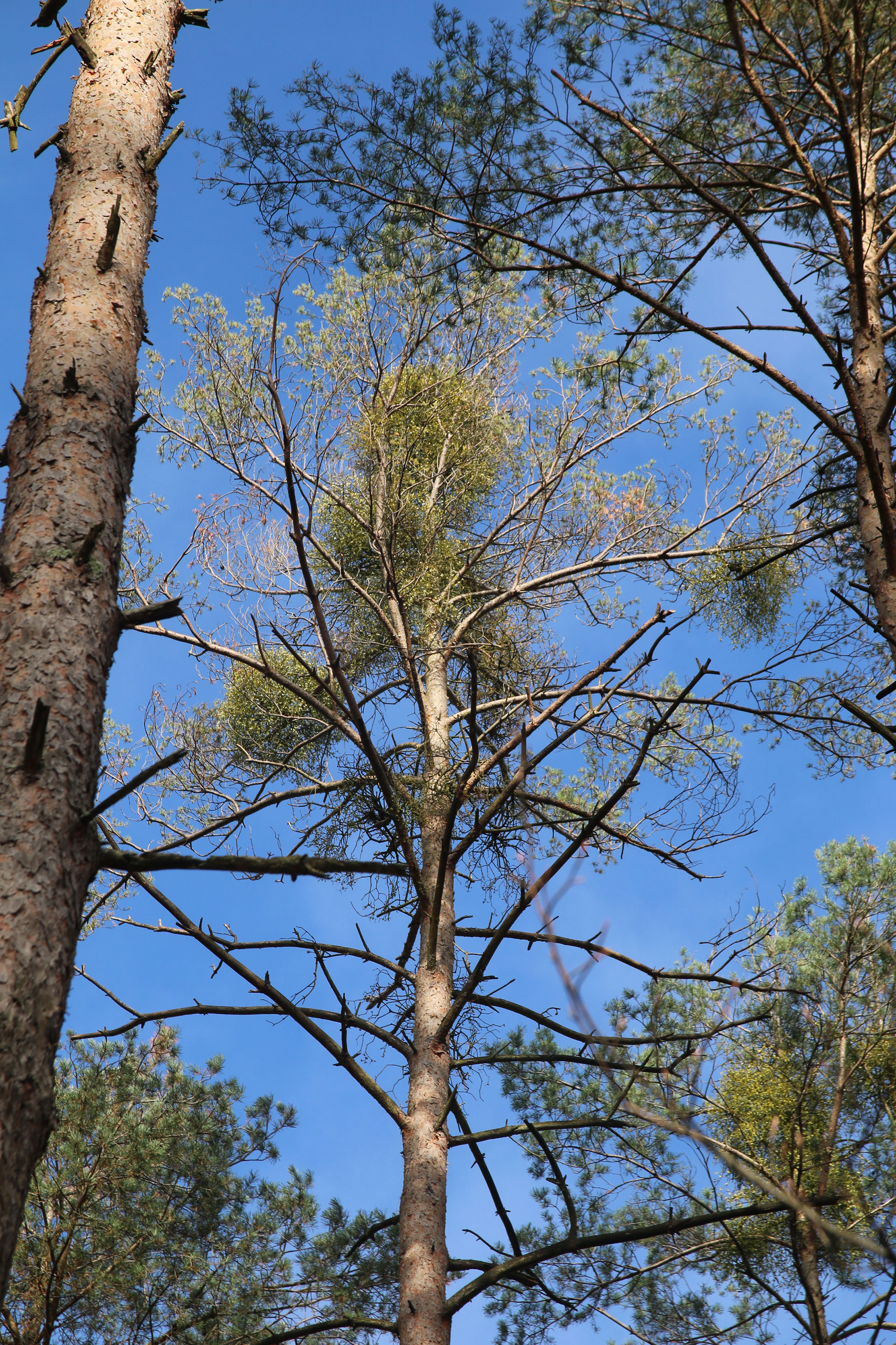 Die Kronenzustandserhebung hat bei der Kiefer landesweit im zweiten Jahr in Folge eine leichte Verbesserung feststellt, auch wenn die Ausfall- und Mortalitätsrate auffällig hoch war [6]. Dies korrespondiert mit den Meldungen der forstlichen Dienststellen, die zur Kiefernkomplexkrankheit um etwa ein Viertel zurückgegangen sind und in Bezug auf Trockenschäden sogar nur noch 37 % des Vorjahreswertes erreichen. Demgegenüber haben die Flächenmeldungen zum Diplodia-Pilzbefall und zu Mistelinfektionen (Abb. 5) wieder deutlich zugenommen. Besonders auffällig ist auch der Umfang von Kiefern, die insbesondere von rindenbrütenden Borkenkäfern betroffen waren, um das Fünffache auf nahezu 500 ha deutlich gestiegen. So bleibt der Zustand der Kiefer auf großer Fläche insgesamt weiterhin besorgniserregend. Besonders auf den armen und trockenen Sandstandorten der Oberrheinebene zeichnete sich auch 2024 größtenteils keine durchschlagende Erholung des Gesundheitszustandes der Kiefern ab.