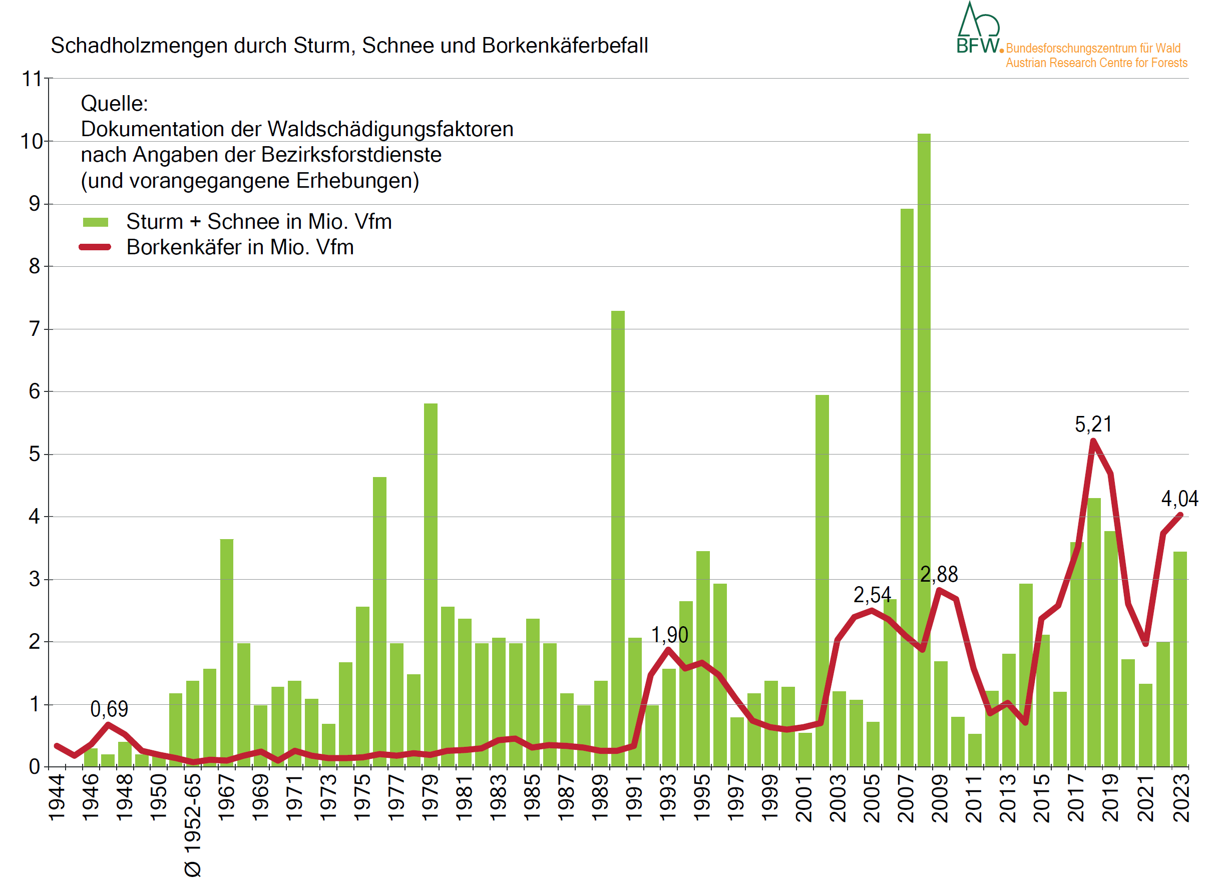 Der seit 2022 feststellbare, neuerliche Aufwärtstrend bei Schäden durch Borkenkäfer hielt an, wenn auch mit geringerem Anstieg: Die DWF-Ergebnisse zeigten für das gesamte Bundesgebiet Borkenkäferschäden in Höhe von 4,04 Mio. Vfm (plus 8 %), das entspricht dem dritthöchsten Wert in der Zeitreihe. Von diesen Schäden wurden 92 % durch den Buchdrucker verursacht.