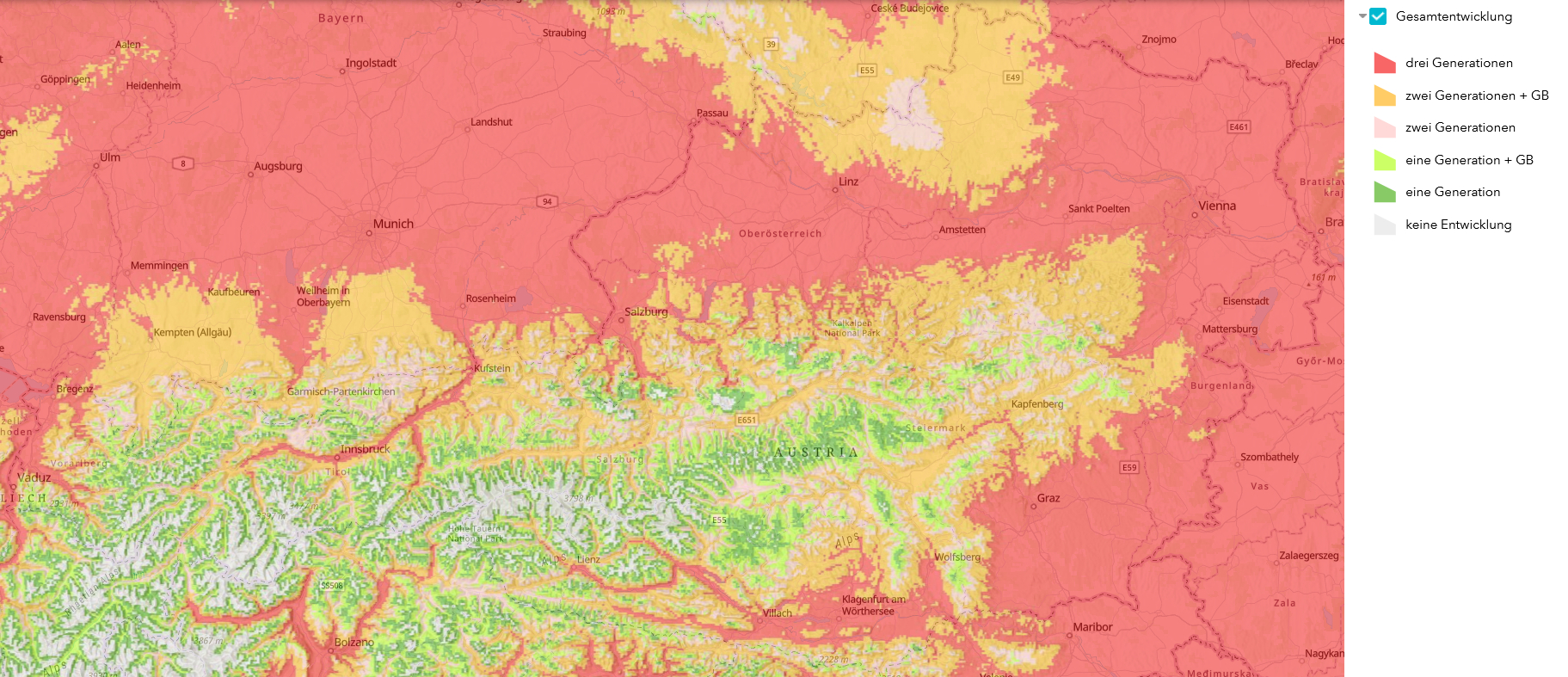 Abb. 2: Die vom Entwicklungsmodell PHENIPS (Universität für Bodenkultur) anhand von Temperatur und Einstrahlung errechnete maximale Entwicklung des Buchdruckers in Österreich. Foto: Screenshot / BOKU