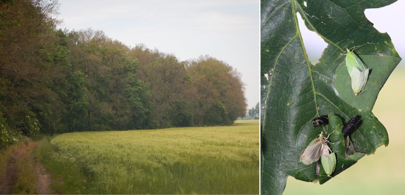 Die im Winter 2022/23 mit Hilfe von Leimringen erfolgte Überwachung der Frostspanner, als relevanter Vertretergruppe der Eichenfraßgesellschaft, wies auf eine weiter sinkende Tendenz hin. Die im Frühjahr dokumentierte Fraßfläche bestätigte die erwartete geringe Schadintensität, die gemeldeten absoluten Schadflächen nahmen im Vergleich zum Vorjahr aber zu. Die Prognose des zu erwartenden Fraßes durch den Grünen Eichenwickler, ließ für die relativ wenigen untersuchten Bestände im Landeswald für das Frühjahr 2023 ebenfalls ein niedriges Dichteniveau erwarten. Dies bestätigte sich anhand der verhältnismäßig geringen Schadfläche, auch wenn diese im Vergleich zum Vorjahr zunahm. In der Oberlausitz im Privatwald zeigten sich lokal starke Fraßschäden und auffällige Falteraktivitätsdichten (s. Abb. 5).