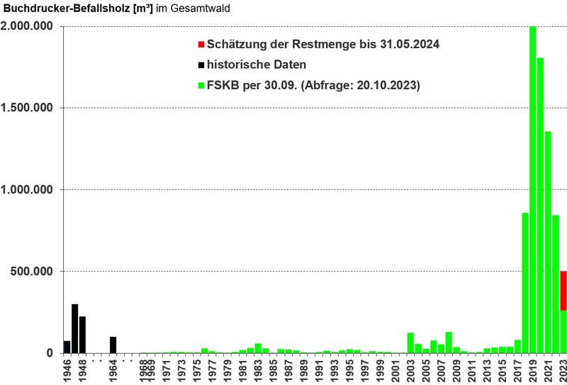 Insgesamt beläuft sich die in den letzten Jahren in den sächsischen Wäldern allein durch den Buchdrucker verursachte Befallsholzmenge mittlerweile auf über 7 Mio. m³. Davon entfielen immerhin noch 0,84 Mio. m³ auf das Borkenkäferjahr 2022/2023 und im aktuellen BK-Jahr 2023/2024 wurden in den Monaten Juni bis September 260.000 m³ registriert. Dies entspricht in etwa der Hälfte der Vorjahresmenge im Bezugszeitraum. In Abbildung 1 ist die Entwicklung der Befallsholzmengen seit 1946 grafisch dargestellt.