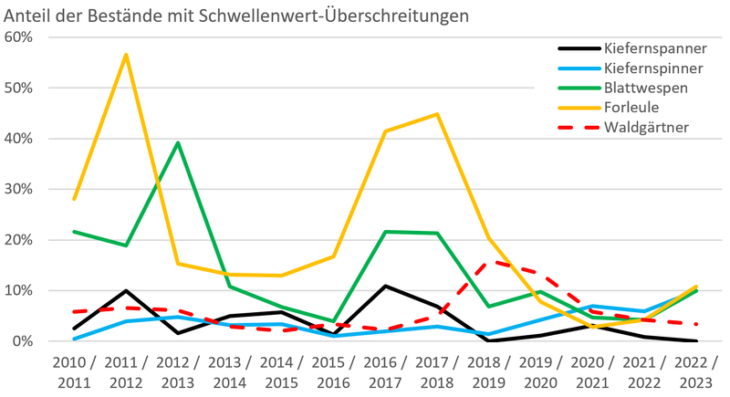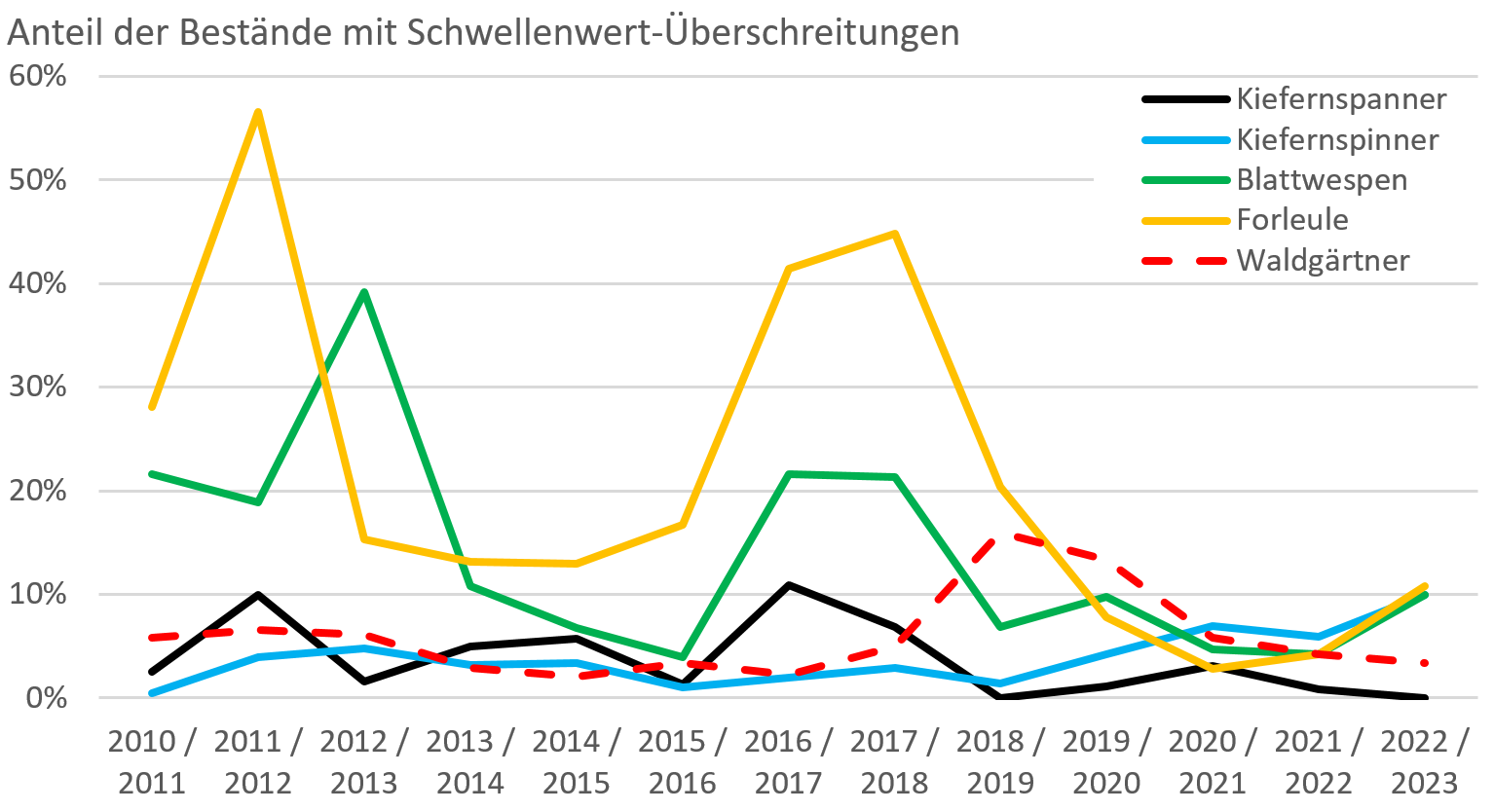 Für die nadelfressenden Schädlingsarten zeigten die Ergebnisse der Winterbodensuche, dem Standardmonitoringverfahren für diese Gruppe, für das Jahr 2023 insgesamt noch unkritische Populationsdichten. Die Dichten der Forleule stiegen zwar weiter an, zeigten aber nach wie vor Latenzverhältnisse. Auch ließen die nachgewiesenen Dichten von Kiefernspinner und Blattwespenarten entsprechend ihres langjährigen Zyklus einen Anstieg auf überwiegend unkritischem Niveau erkennen. Der Kiefernspanner befindet sich zurzeit in der Latenzphase. Die beschriebenen Ausgangsdichten wurden im Laufe der Sommermonate durch das Ausbleiben fraßgeschädigter Flächen bestätigt.