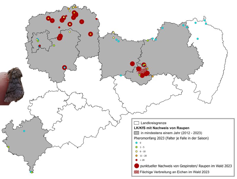 Die Ergebnisse der Schwärmflugüberwachung des Schwammspinners mittels Pheromonfallen im Sommer 2023 bestätigten mit maximal 930 Faltern in einer Falle und überwiegend deutlich geringeren Fängen die aktuelle Latenzphase.