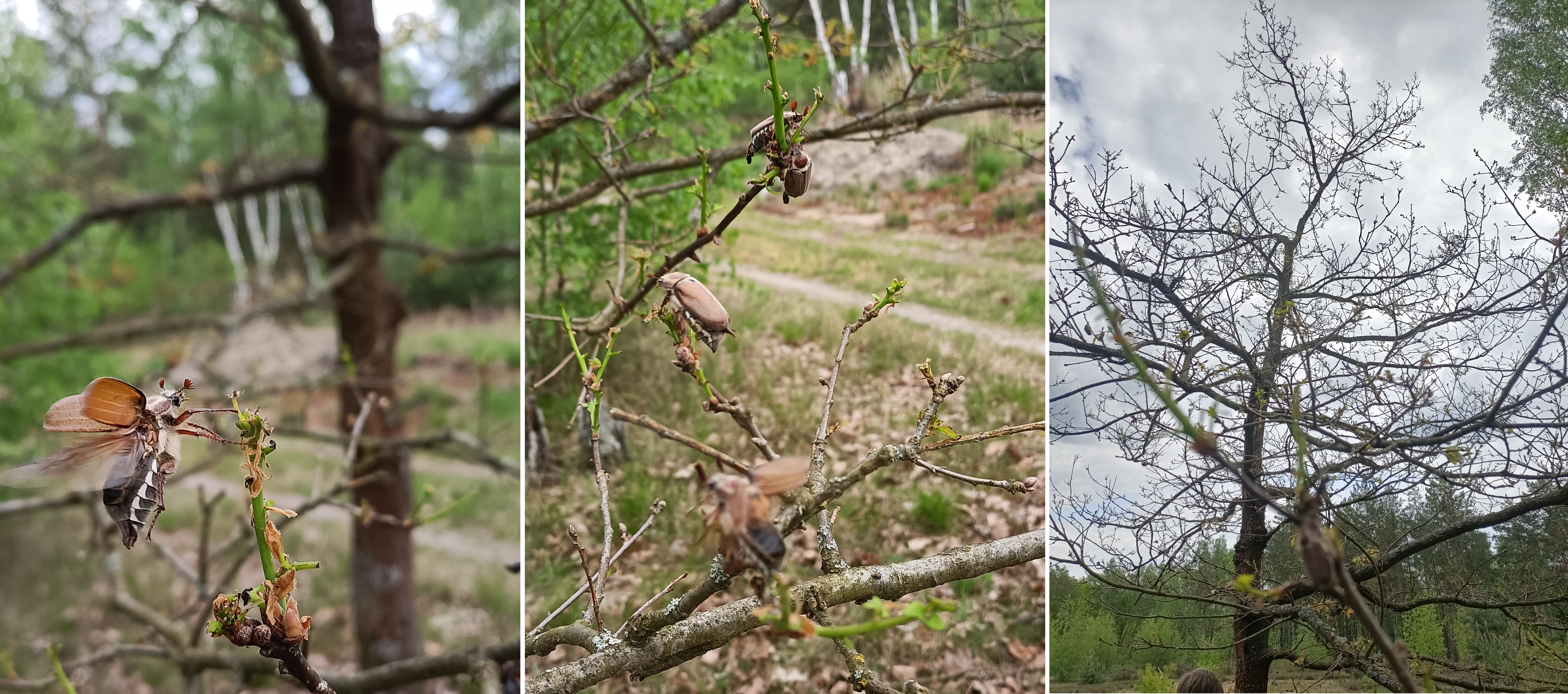 Dem historisch bekannten Zyklus nach war 2023 in Teilen der Oberlausitz mit einem stärkeren Auftreten von Maikäfern zu rechnen. Im Gebiet der Göbelner Heide gab es Beobachtungen von stärkerem Fraß durch die Käfer an Einzelbäumen bis hin zu Kahlfraß. Z. T. war auch merkliches bis starkes Schwärmen durch Waldmaikäfer zu verzeichnen (s. Abb. 7).