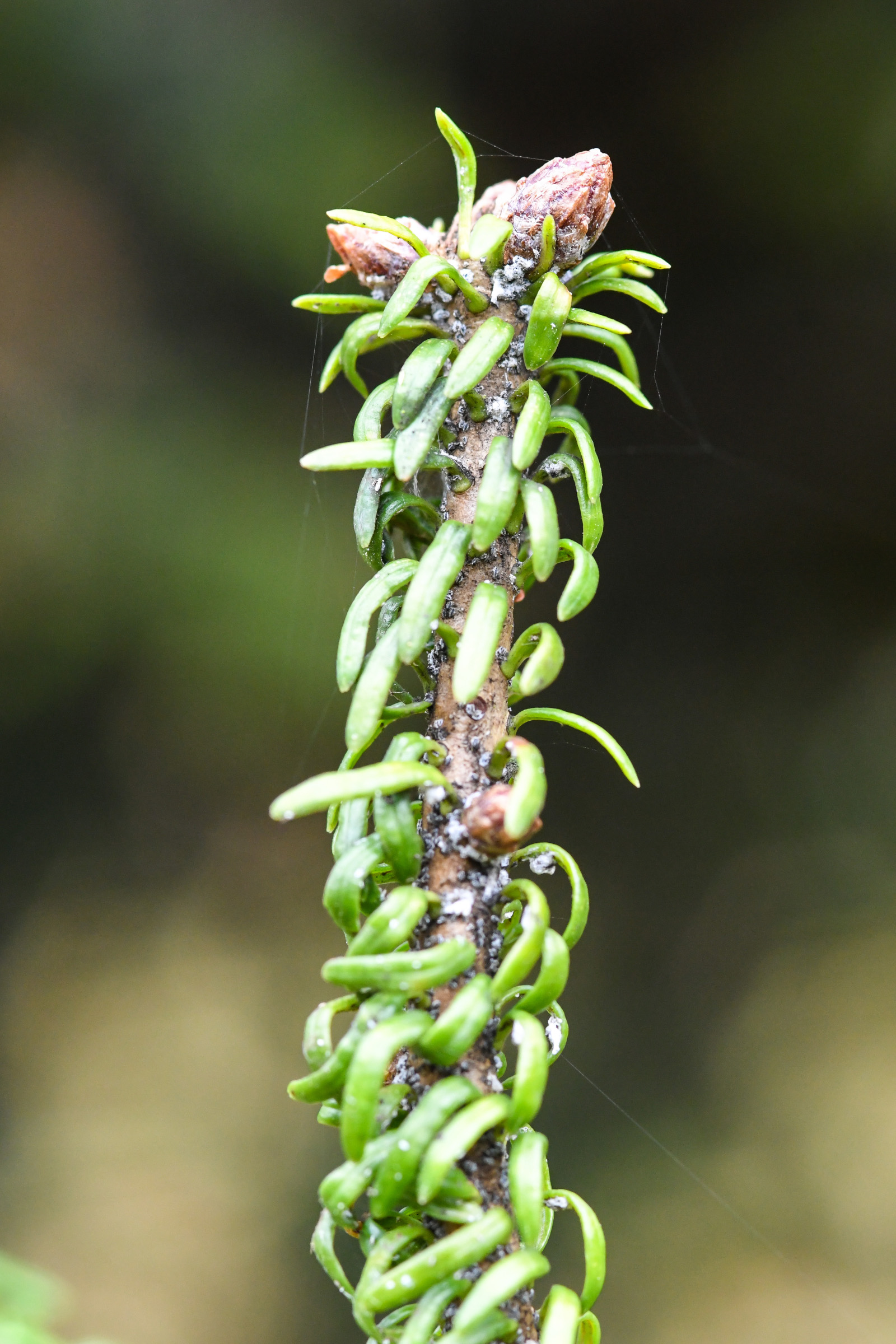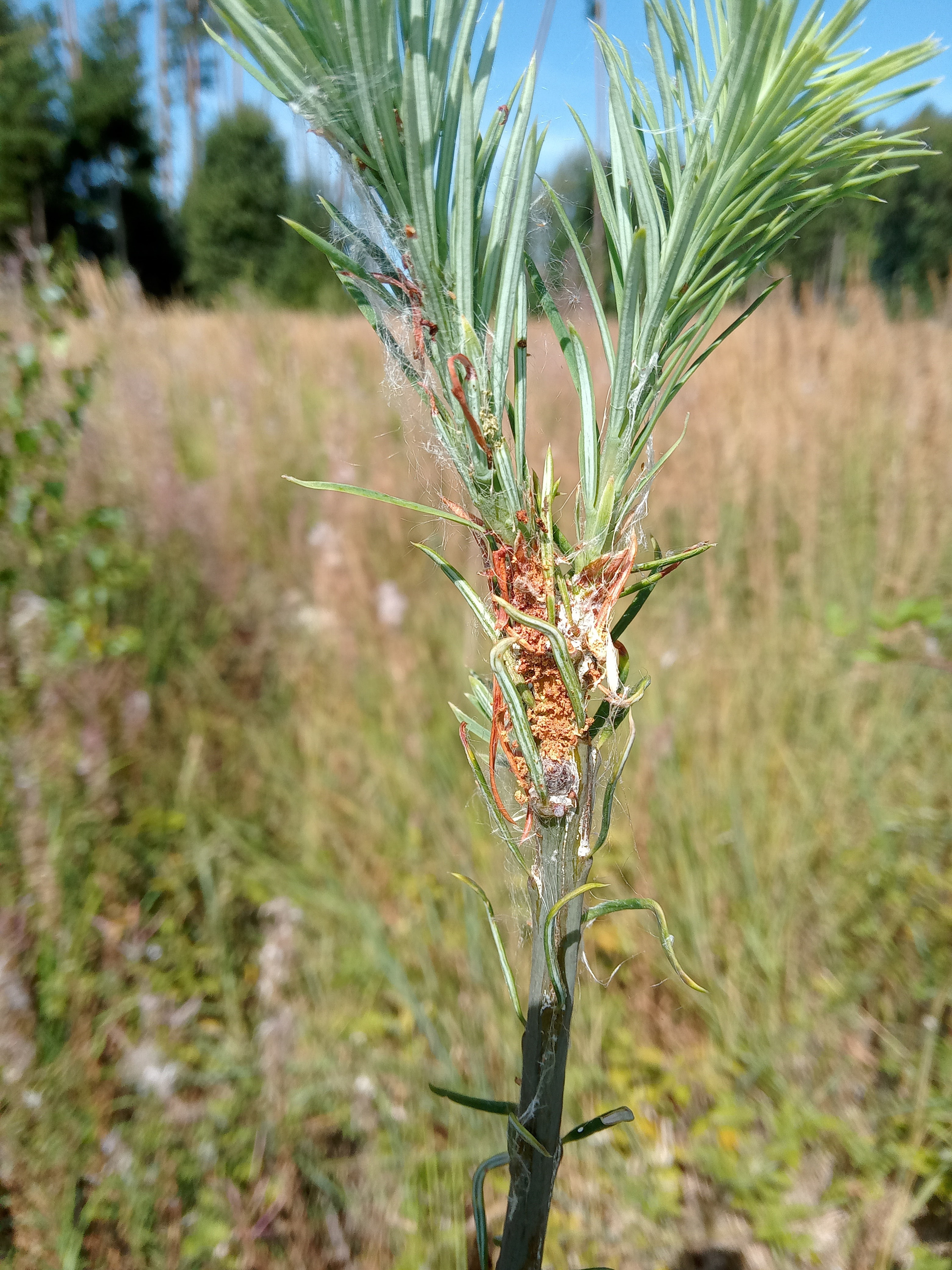 Immer wieder kommt es auch zu Verkümmerung des Terminaltriebs durch den Fichtenzapfenzünsler (Dioryctria abietella) (Abbildung 5). Dieser ist nicht – wie der Name vermuten lässt – nur an Fichtenzapfen zu finden, sondern miniert gelegentlich an den Trieben von Fichte, Douglasie, Tanne und Lärche.