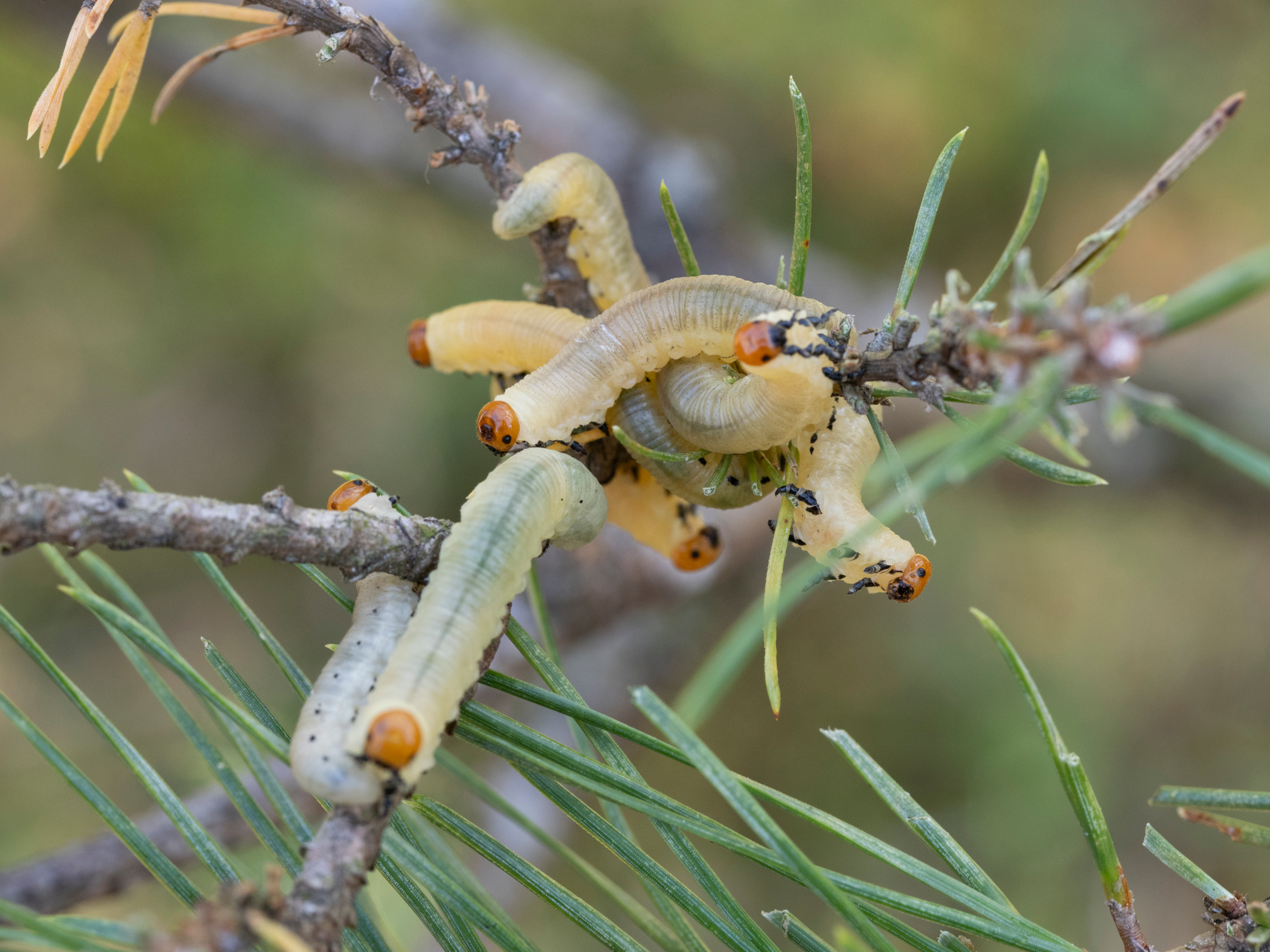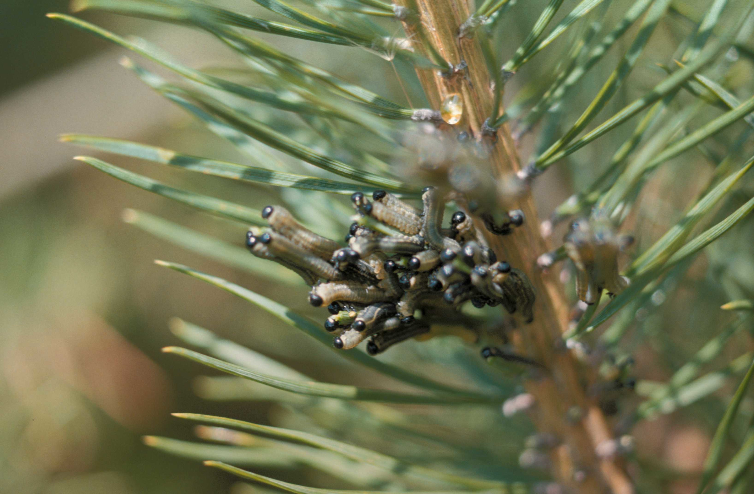 Im vergangenen Jahr trat im Frühjahr die Rotgelbe Kiefernbuschhornblattwespe (Neodiprion sertifer) an Kiefernnaturverjüngung in Erscheinung (Abbildung 7, rechts). Sie unterscheidet sich von der Gemeinen Kiefernbuschhornblattwespe (Diprion pini) (Abbildung 7, links) v. a. in der Farbe der Kopfkapsel. Bei der Neodiprion ist diese glänzend schwarz, bei der Diprion pini eher orange-braun. Die Neodiprion frisst im Frühjahr nur an jüngeren Bäumchen bis ca. 2 m Höhe an den älteren Nadeln. Der Maitrieb wird verschont. Meist ist eine starke Vermehrung nur von kurzer Dauer – sie kann aber auch über Jahre chronisch auftreten. In diesem Fall leiden die jungen Kiefern stark und sind anfälliger für Sekundärschädlinge. Die Larven der Diprion fressen ab Ende Mai ebenfalls an den älteren Nadeln. Ist es während des Fraßes sehr warm und trocken, kann es zur Ausbildung einer 2. Generation im Juli/August kommen. Dies ist an den sogenannten Sommerkokons erkennbar, die an der Rinde der Altkiefern, an Zweigen von Jungkiefern oder am Boden zu finden sind. Die Larven der Sommergeneration fressen dann auch an den Nadeln des diesjährigen Triebes, was die Pflanze bei starkem Fraß zum Absterben bringen kann.