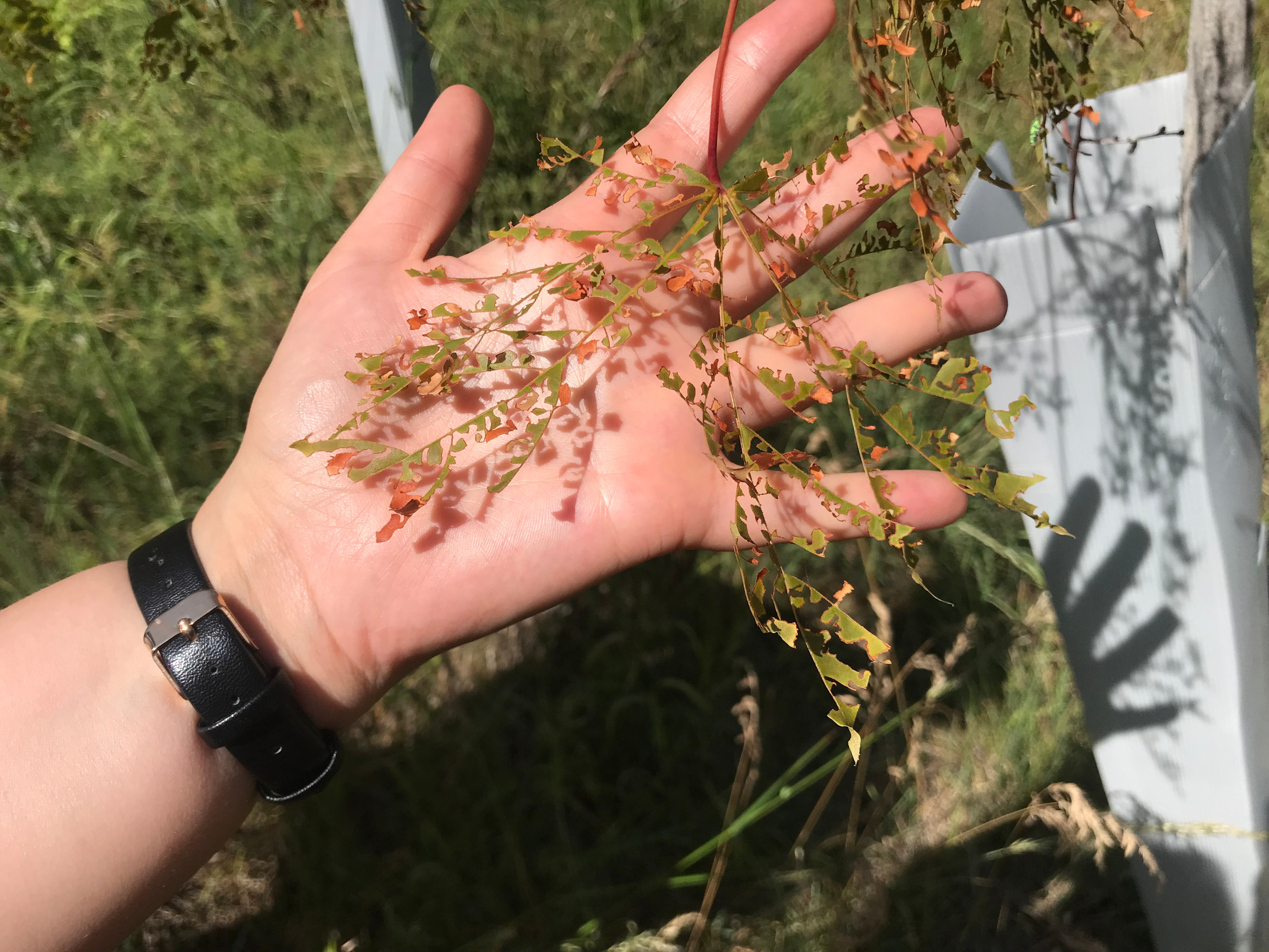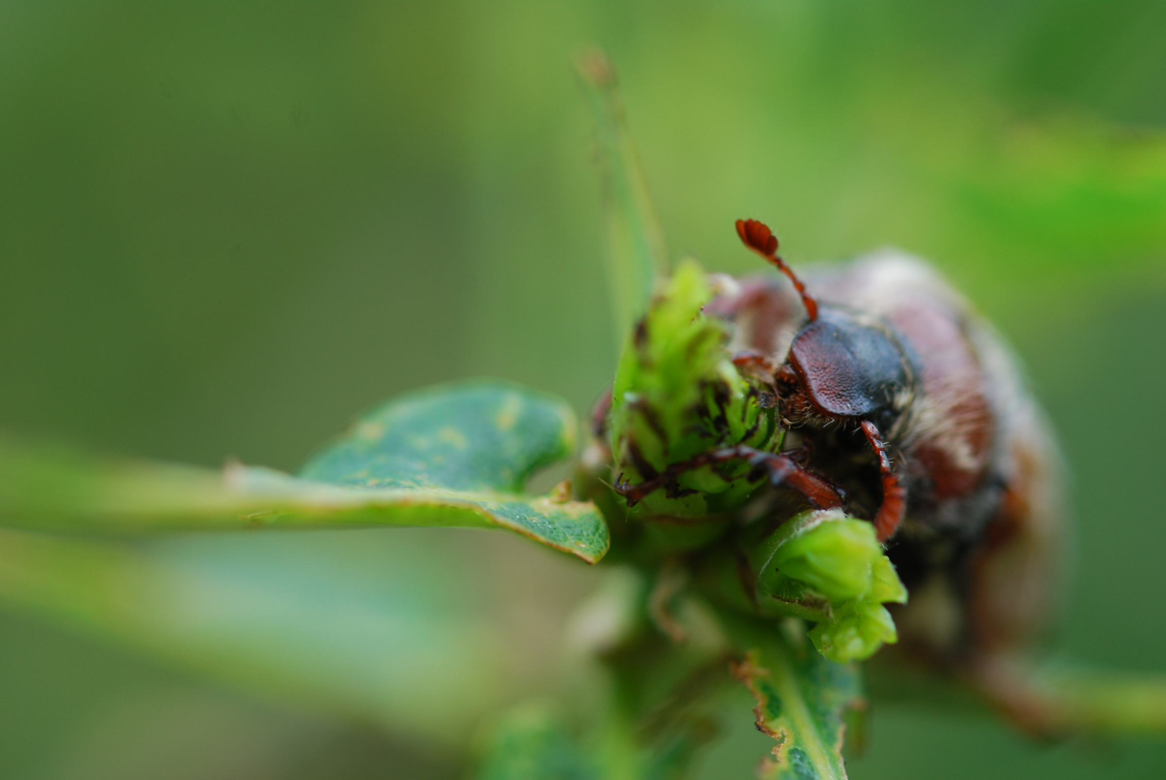 Auffällig war ab Ende Mai letzten Jahres eine starke Vermehrung des Silbernen Grünrüsslers (Phyllobius argentatus). In warmen Sommern können diese Käfer junge Laubbäume kahlfressen, sodass meist nur noch die Blattmittelrippen erhalten bleiben (Abbildung 1). Die Käfer fressen an den Blättern, während die Larven die Wurzeln der Bäume benagen. Nach der Paarung im Juni legen die Weibchen ihre Eier in den Boden. Nach etwa 3 Wochen schlüpfen die Larven und beginnen ihren Fraß an den Wurzeln. Im folgenden Frühjahr verpuppen sich die Larven. Die neue Käfergeneration erscheint dann etwa ab April bis August, mit Schwerpunkt Mai. Der Grünrüssler frisst an einer Reihe von Laubbäumen wie Ahorn, Eichen, Rotbuchen, Birken, Weiden, einigen Obstbäumen und Hasel. Vereinzelt sind sie sogar an Nadelbäumen zu finden.
