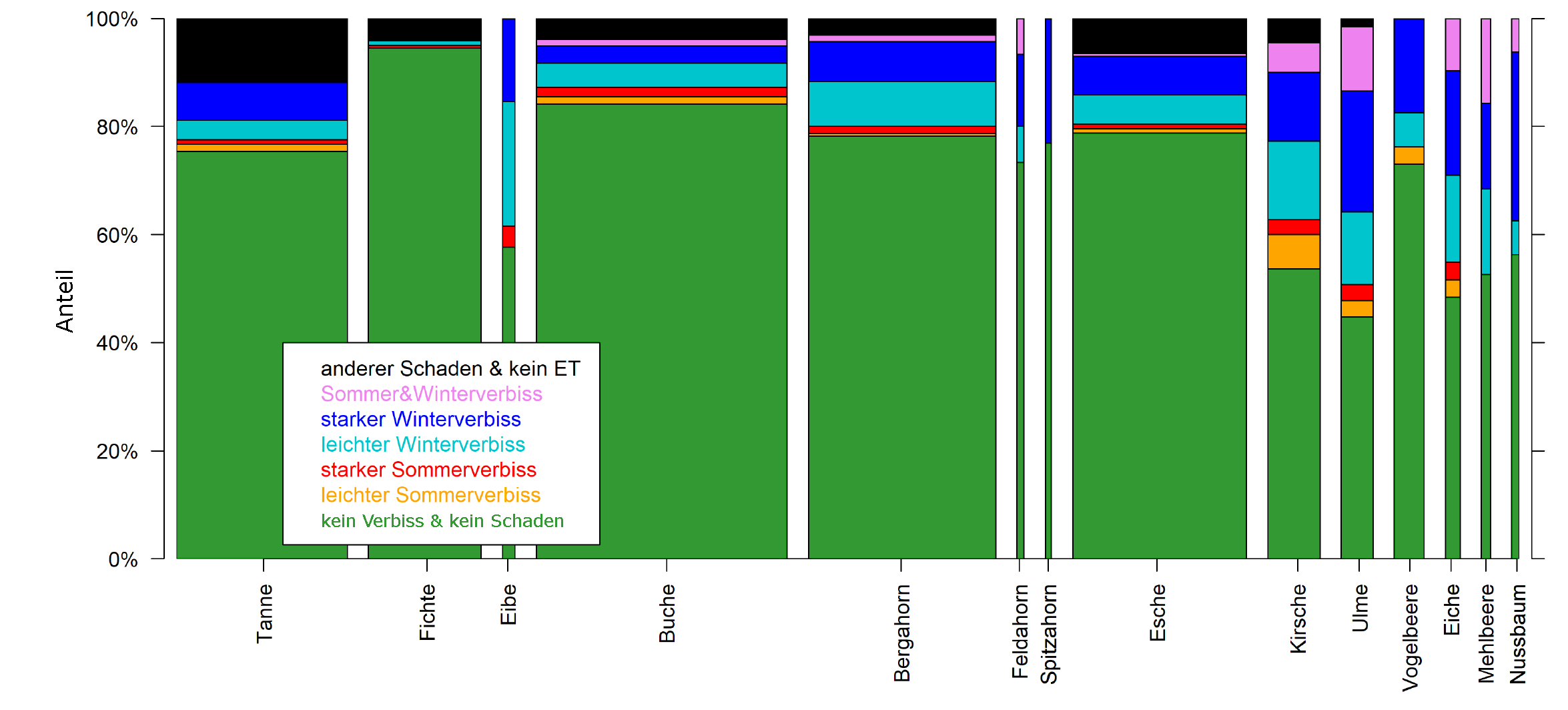 Winterverbiss war häufiger als Sommerverbiss, auch bei allen Laubbaumarten (Abb. 2). Bei einigen Arten war leichter Winterverbiss häufiger als starker Winterverbiss, darunter Eibe, Buche, Bergahorn und Kirsche. Im Gegensatz dazu war starker Winterverbiss häufiger bei Tanne, Esche, Ulme, Vogelbeeren, Eichen, Nussbaum, Feld- und Spitzahorn. Starker Verbiss hat einen höheren Einfluss auf das Aufwachsen der Bäumchen, da weniger Knospen vorhanden sind und die Bäumchen dadurch meistens weniger schnell reagieren. Rund 10-15% der Ulmen, Mehlbeeren und Eichen waren zudem in beiden Jahreszeiten verbissen.