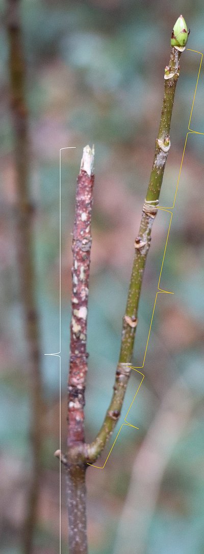 Wird das Wachstum je Probefläche und Höhenklasse im Verhältnis zur Buche verglichen, so war das Reststück nach leichtem Endtriebverbiss von Tanne, Esche, Bergahorn und Kirsche grösser als der Zuwachs der unverbissenen Buchen. Das bedeutet, dass diese Arten besser wachsen würden als die Buche, wenn sie nicht verbissen würden. Sie verlieren jedoch einen Teil dieses grösseren Höhenzuwachses. Dies, weil der neue Trieb, der als Reaktion auf den Verbiss gebildet wird, in den allermeisten Fällen weiter unten aus dem Reststück herauswächst und nicht an der Spitze des verbissenen Triebes (Abb. 3). Somit verschiebt Verbiss das Zuwachsverhältnis zu Gunsten von Buche.