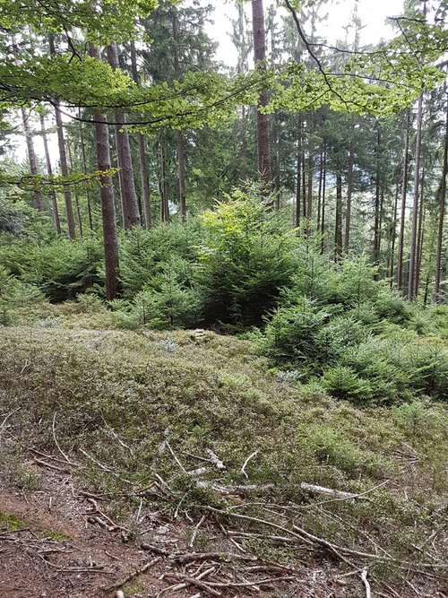 Abb. 7 - Ist die Verjüngungsdichte gering (wie im Ausschnitt vorne im Bild), ist jedes Bäumchen für die spätere Stammzahl im Bestand wichtig. Ist die Verjüngungsdichte hingegen gross (wie in der Lücke hinten im Bild), spielt Verbiss an einzelnen Bäumchen keine Rolle, solange nicht ein erheblicher Teil der Bäumchen einer Zielart stark verbissen wird und diese deshalb im Höhenwachstum gegenüber anderen Baumarten zurückbleiben. Foto: Andrea D. Kupferschmid (WSL)