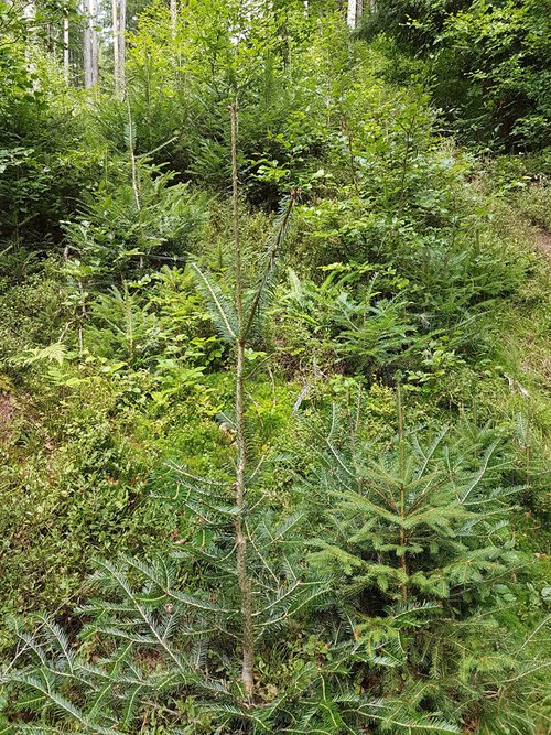 Abb. 6 - Leichter Verbiss ist kein entscheidender Einflussfaktor, falls die leicht verbissene Art (im Bild die Weisstanne) trotz mehrmaligem Verbiss mindestens gleich gut oder gar besser wächst als eine am gleichen Ort vorkommende unverbissene Art (im Bild die Fichte). Foto: Andrea D. Kupferschmid (WSL)