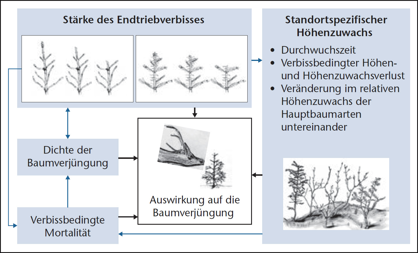 Die Verbissintensität als relative Anzahl verbissener Endtriebe sagt zudem wenig über die langfristigen Auswirkungen des Verbisses auf die Baumverjüngung aus. Damit dieser Einfluss abgeschätzt werden kann, sind nebst dem Verbissprozent Informationen zu den folgenden vier Faktoren (Abb. 2) nötig: