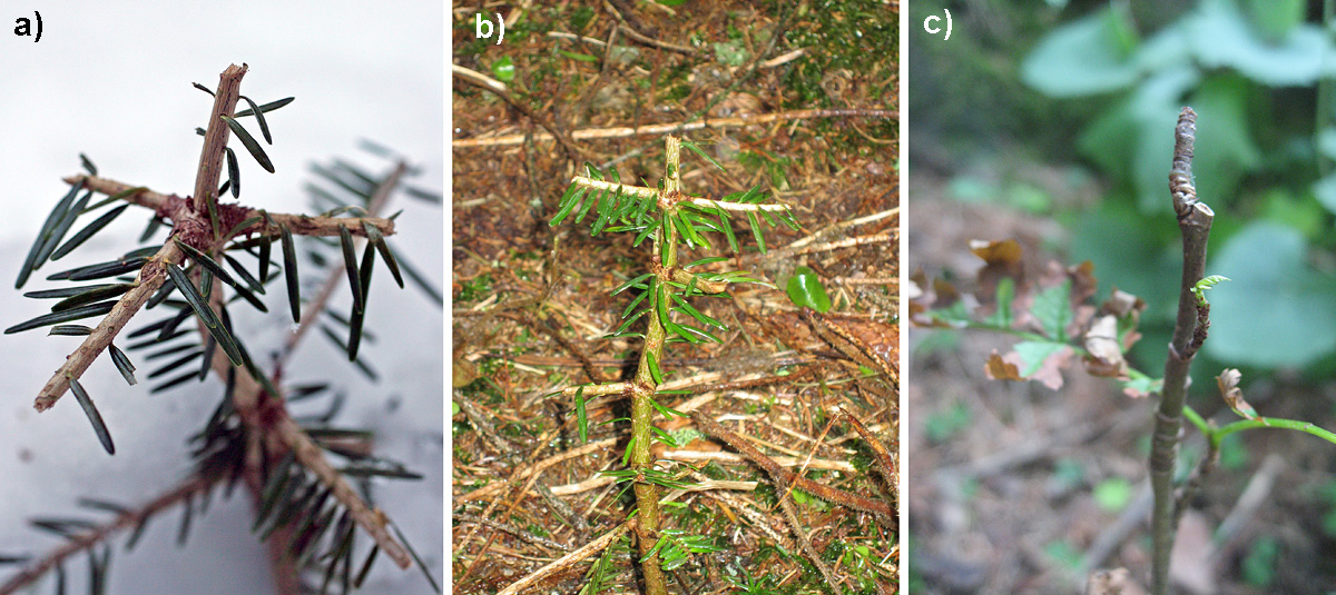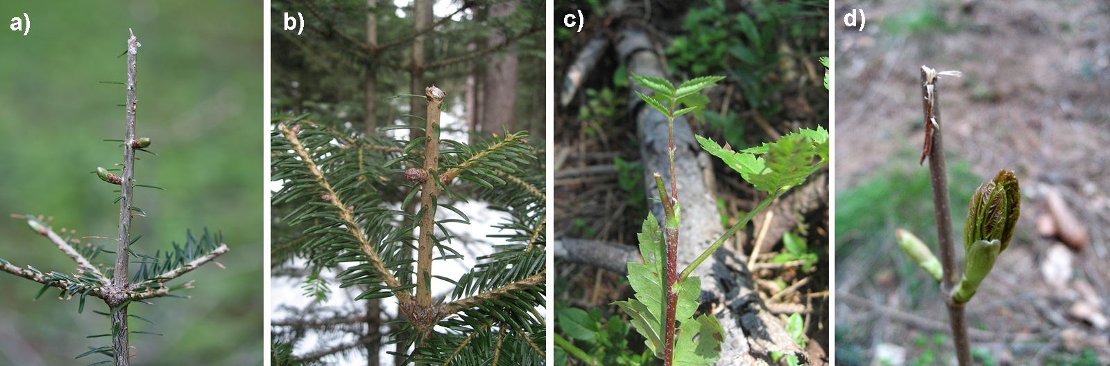 Abb. 3 - Leichter Endtriebverbiss an Weisstanne (a und b), Vogelbeere (c) und Bergahorn (d). Nur die Endtriebknospen wurden abgefressen, der Hauptteil des letzten Höhenzuwachses inklusive der seitlichen Knospen am Endtrieb ist noch vorhanden. Diese Bäumchen erlitten deshalb fast keine Reduktion der Baumhöhe und können in der Regel unverzüglich einen Ersatzendtrieb bilden. Fotos: Andrea D. Kupferschmid (WSL)