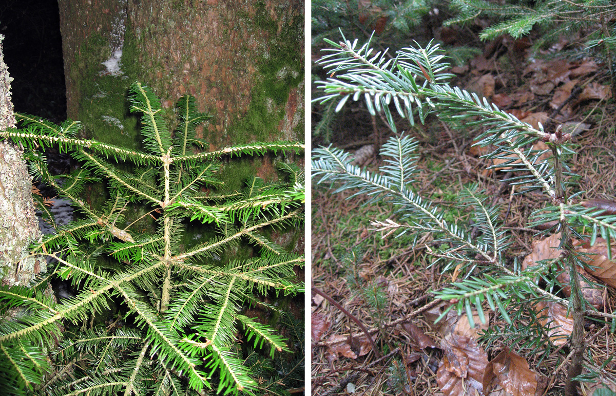 Abb. 5 - Weisstannen ohne Endtrieb (Kategorie "kein Endtrieb vorhanden"), vermutlich als Folge von früherem starkem Endtriebverbiss. Die Bäume sind mittels ihrer Seitentriebe nur in die Breite gewachsen, weisen also eine zeitliche Verzögerung der Endtriebbildung von bisher einem Jahr aus. Fotos: Andrea D. Kupferschmid (WSL)