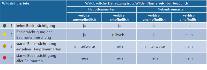 Die Stufe 1 steht in der Regel für keine Beeinträchtigungen der natürlichen Baumverjüngung durch wildlebende Huftiere, Stufe 2 für eine Beeinträchtigung der Baumartenmischung oder Qualitätsminderung, Stufe 3 für starke Beeinträchtigung der Baumartenmischung inklusive einzelner Hauptbaumarten, Stufe 4 für starke Beeinträchtigung aller Baumarten, d.h. sämtliche Baumverjüngung kann nicht mehr aufwachsen (detaillierte Tabelle siehe Originalartikel).