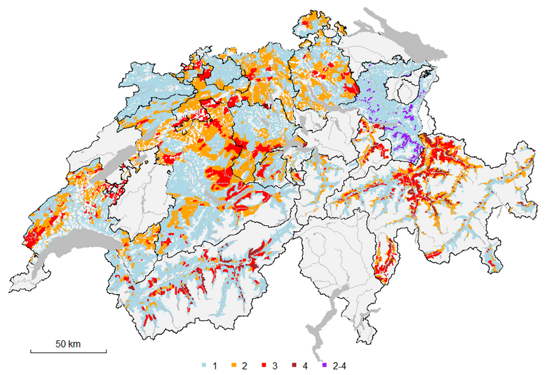 - Der Kanton GR verwendet eine detaillierter gegliederte Wald-Wild-Bewertung mit 5 Kategorien. Auch der Kanton TG benutzt 5 Tragbarkeitskategorien. In diesen beiden Fällen wurden die Kategorien 1 und 2 zur Stufe 1 zusammengefasst und die anderen drei Kategorien entsprechend angepasst.