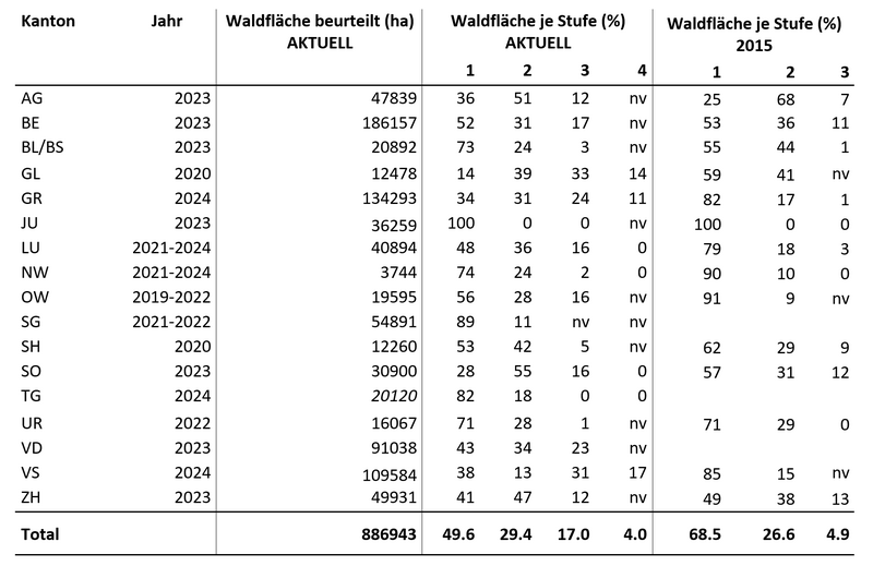 Die beurteilte Waldfläche umfasst aktuell 886’943 ha, das sind knapp 70% der gesamten Schweizer Waldfläche. Sie hat gegenüber dem Überblick aus dem Jahre 2015 um rund 74'000 ha zugenommen. Differenzen entstanden insbesondere, weil die Beurteilungen der Kantone SG, TG und VD neu hinzugekommen sind (Tab. 2) und weil GR und NW andere Beurteilungseinheiten nutzen als 2015 und damit nicht mehr dieselbe Waldfläche betrachten.