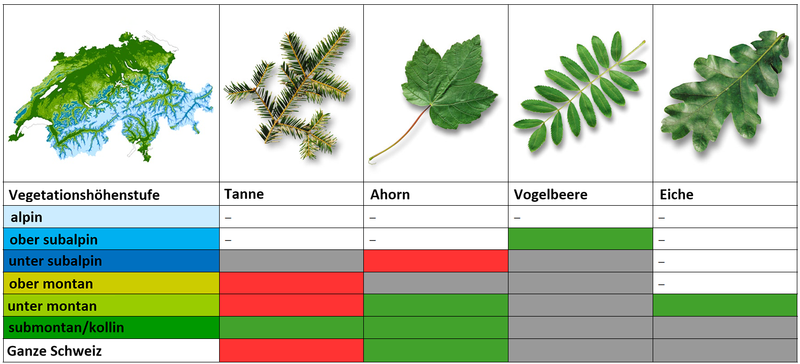 Abb. 7 - Verbissintensitäten von Tanne, Ahorn, Eiche und Vogelbeere gemäss LFI 2009/2013 aufgeteilt nach Höhenstufen. Die Farben der Tabellenfelder zeigen, ob die ermittelten Werte unter dem Grenzwert (grün), im Bereich des Grenzwertes (grau) oder über dem Grenzwert (rot) liegen. Anklicken für mehr Details (PDF)