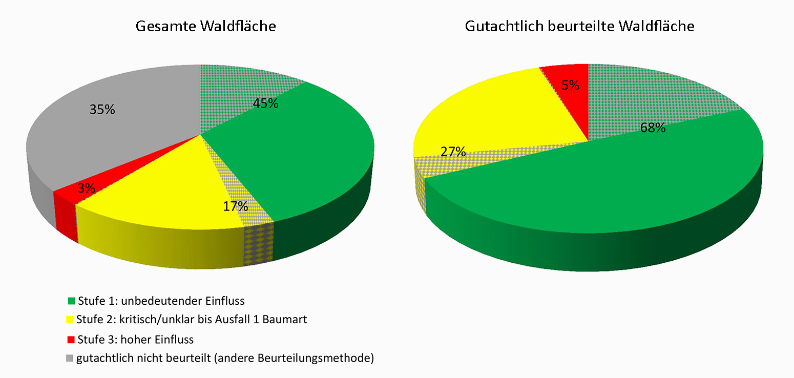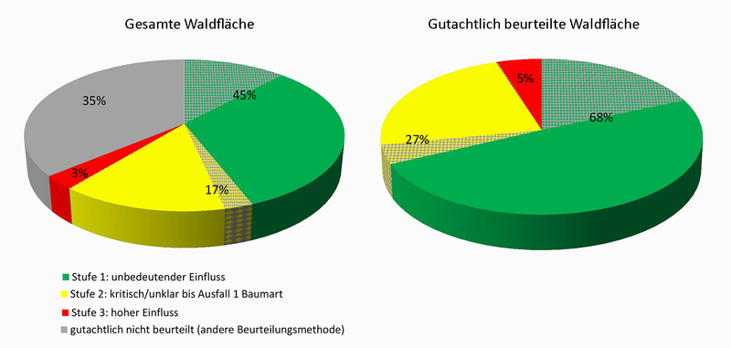Gemäss dieser Einstufung lagen über die Schweiz 68% der beurteilten Waldfläche in der gutachtlichen Stufe 1, 27% in der Stufe 2 und 5% in der Stufe 3 (Abb. 4). Die Stufe 2 ist ein "Sammelbecken" mit je nach Kanton unterschiedlichen Bedeutungen. In Kantonen, welche nur zwei Stufen unterscheiden, wurde die höhere Stufe zurückhaltend dieser gutachtlichen Stufe 2 zugeordnet.