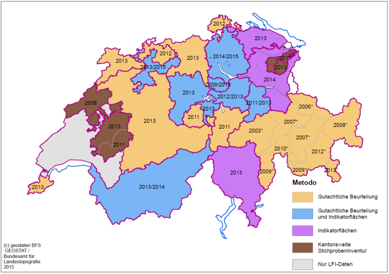 Die grosse Herausforderung für eine schweizweite Übersicht besteht darin, eine Synthese aus sehr unterschiedlichen Datengrundlagen zu erstellen. Angepasst an die jeweiligen Strukturen und Interessen hat jeder Kanton seine eigene Methode entwickelt, um die Auswirkungen der Wildtiere auf die Waldverjüngung zu erfassen. Die unterschiedlichen Methoden wurden zudem in verschiedenen Jahren und mit unterschiedlichem Qualitätsstandards angewendet (Abb. 2).