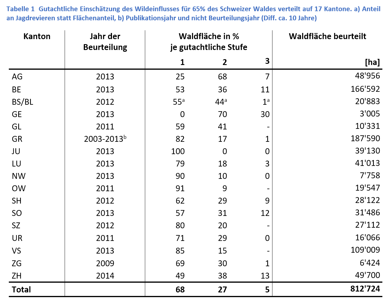 Zwischen den Kantonen zeigen sich grössere Unterschiede (Tab. 1). Im Kanton Genf liegen beispielsweise 70% der Waldfläche in der gutachtlichen Stufe 2, 30% der Waldfläche in der gutachtlichen Stufe 3. Im Kanton Jura hingeben ist der Wildeinfluss gering (100% gutachtliche Stufe 1). In zehn der 17 Kantone mit gutachtlichen Beurteilungen werden mehr als 25% der Waldfläche den gutachtlichen Stufen 2 und 3 zugeordnet.