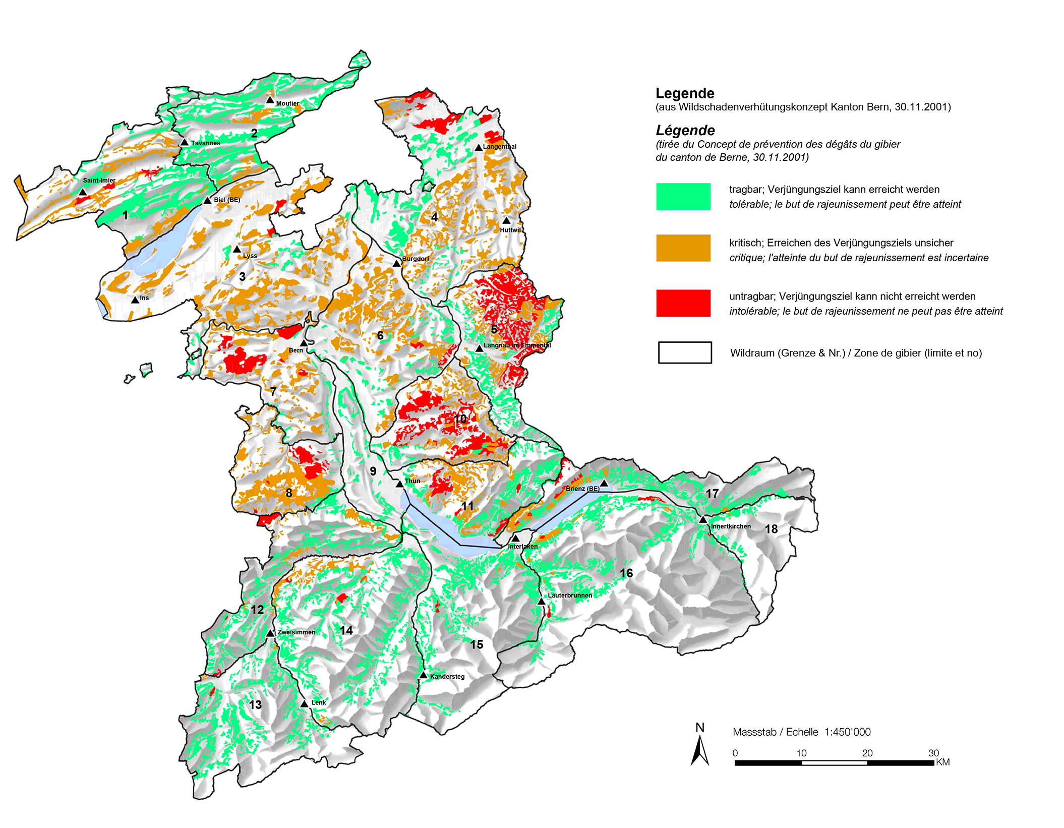 Auch kleinräumig kann der Verbisseinfluss sehr stark variieren. Wo Daten zu kleineren Einheiten wie Wildräumen oder Forstkreisen zur Verfügung stehen, zeigen sich regionale Unterschiede innerhalb der Kantone sehr deutlich, zum Beispiel im Kanton Bern (Abb. 5). Kantonsweit liegt hier "nur" 11% der Waldfläche in der gutachtlichen Stufe 3 (Tab. 1). In drei der 18 Wildräume bewegt sich dieser Wert jedoch zwischen 30 und 50%. In sechs Wildräumen wird der Schwellenwert überschritten, ab dem die Vollzugshilfe Wald und Wild ein Wald-Wild-Kozept mit Massnahmenplan vorschreibt. Dieses Beispiel zeigt, dass bei Aussagen über grössere Gebiete lokal als gravierend beurteilte Verbisssituationen verwischt werden.