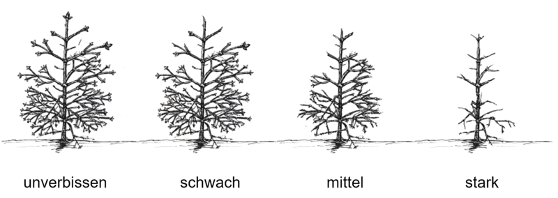 Die "Verbissstärke" – auch "Stärke des Verbisses" oder "Schädigungsgrad" genannt – gibt an, ob nur die Endknospe, ein Teil des letzten Höhenzuwachses, grosse Teile des Höhenzuwachses oder End- und Seitentriebe alle stark abgeäst werden.
