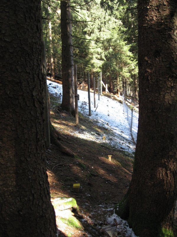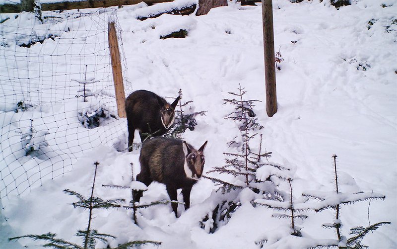 Abb. 1 - Fotofallenbild eines 5×5-m-Zaunes mit vor 10 Jahren gepflanzten jungen Tannen. Die Hälfte des Zaunes wurde im Frühling 2009 geöffnet, doch erst im Winter 2009/2010 nach dem ersten Schneefall verbiss das Gamswild die jungen Bäume. Foto: Andrea D. Kupferschmid (WSL)