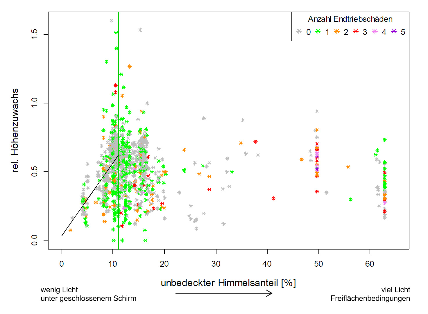 Ein früher Ausaperungszeitpunkt, z.B. unter liegendem Sturmholz, führte auch in anderen Studien zu erhöhtem Verbiss. Dafür stellt man in unbeschirmten, vergrasten Flächen tendenziell mehr Mausfrass fest, sodass Verbiss entlang des ganzen Lichtgradienten stattfindet, aber nicht immer durch die gleichen Tierarten. Da das Wachstum ab ungefähr 11% unbedecktem Himmelsanteil gut ist (Abb. 4), entwachsen die Tannen dort dem Äser rascher als unter starker Beschattung.