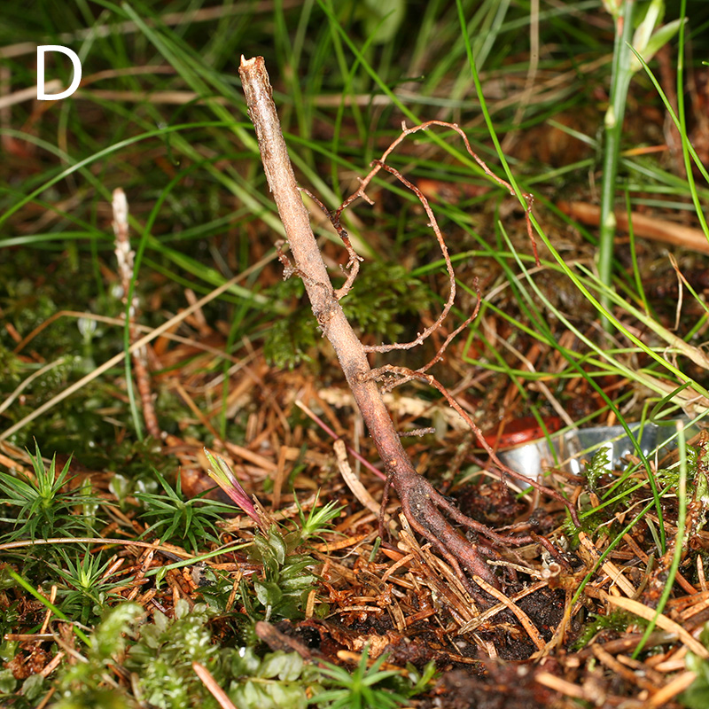 Abb. 9 - Eine unterschiedliche "Verbiss-Stärke" führt zu unterschiedlichen Reaktion nach Verbiss. A: Aufrichten eines Seitentriebs; B: leichter Verbiss der Endknospen und Reaktion aus vorhandener Knospe am Rest des Endtriebes; C: starker Verbiss mit Reaktion aus neu angelegten Knospen beim Ast-Quirl; D: Totverbiss. Fotos: Andrea D. Kupferschmid (WSL)