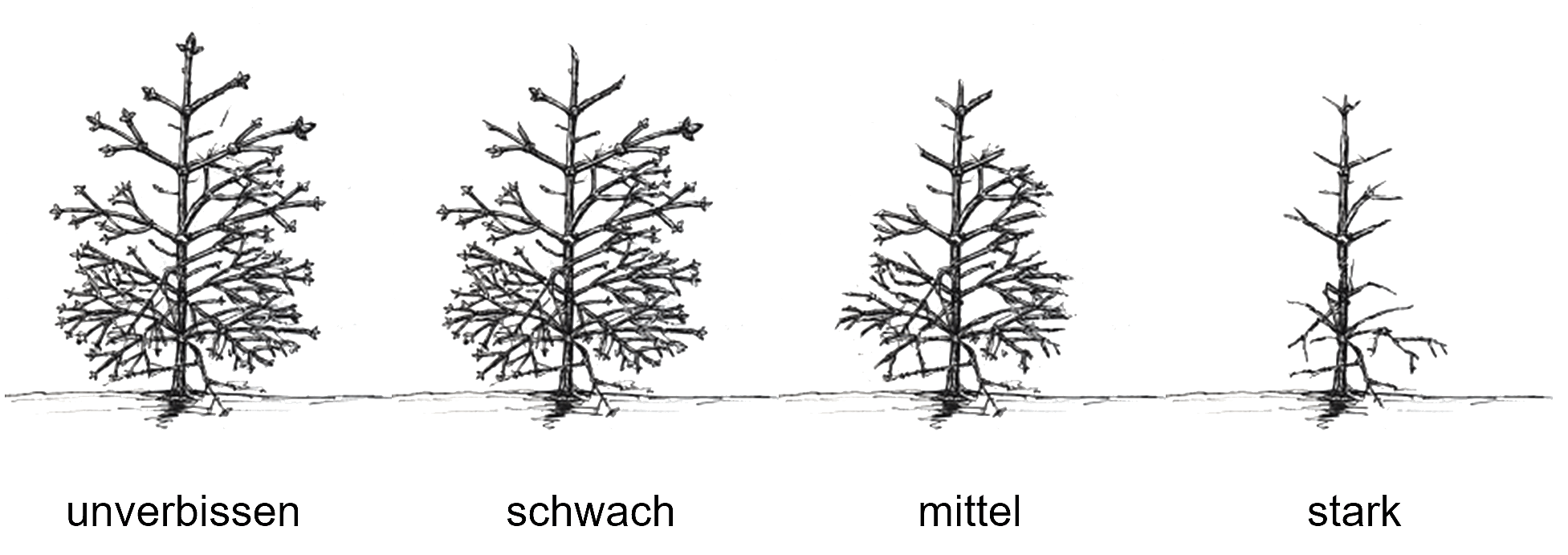 Entscheidend für das Aufkommen der Tannenverjüngung ist aber weniger die absolute Wachstumsrate als vielmehr ihr Wachstum im Vergleich zu anderen Baumarten. Werden Tannensämlinge zwar oft, aber nur wenig verbissen (z.B. immer nur die Endknospen, also bei einer niedrigen Verbissstärke) bei sonst für die Tanne guten Bedingungen, können sie unter Umständen immer noch gleich gut wachsen wie Fichten und Buchen und gemeinsam mit diesen aufkommen. Werden Tannen aber zu stark verbissen (z.B. jeweils grosse Teile der End- und Seitentriebe, also bei einer hohen Verbissstärke), sterben einige direkt verbissbedingt ab (Totverbiss) und die überlebenden Tännchen bleiben gegenüber anderen Baumarten zurück, was zur Entmischung führen kann. Wir empfehlen deshalb, bei der Beurteilung des Verbisses auch die Verbissstärke zu berücksichtigen.