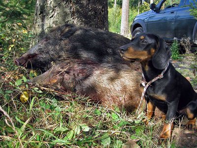 Abb. 2: Jagdstrecke mit Slowakischer Schwarzwildbracke: Die wichtigste Maßnahme ist und bleibt die Regulierung der Schwarzwildbestände durch die Jagd.
