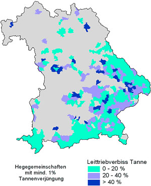 Die Erhebungen zum Verbissgutachten zeigen, dass die Schwerpunkte der Tannenverjüngung im Alpenraum, im östlichen Teil des Tertiären Hügellandes sowie im Bayerischen und Oberpfälzer Wald liegen. In diesen Gebieten beträgt der Tannen-Anteil in den Verjüngungen häufig über 5 %. Die Tanne ist aber auch in allen übrigen bayerischen Landschaften, wenn auch meist mit sehr geringen Anteilen, vertreten. Landesweit erreicht die Tanne einen Anteil von 4 % in der Verjüngung. Die regionalen Unterschiede in der Verbissbelastung der Tanne zeigt Abb. 1. Ausgewertet wurden nur die Hegegemeinschaften, die mindestens 1 % Tanne in der Verjüngung aufwiesen. Der häufig geringere Verbiss in den wald- und tannenreichen Gebieten Süd- und Ostbayerns fällt auf.