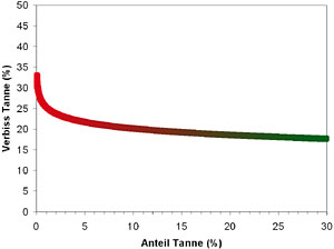 Bei der gegenwärtigen Verbisssituation ist zur Risikominimierung daher ein Tannenanteil von mindestens 2 % in der Verjüngung wünschenswert, oder einfacher gesagt: Bei einem höheren Tannenanteil in der Verjüngung haben mehr Tannen die Chance, "ungeschoren" davon zu kommen.