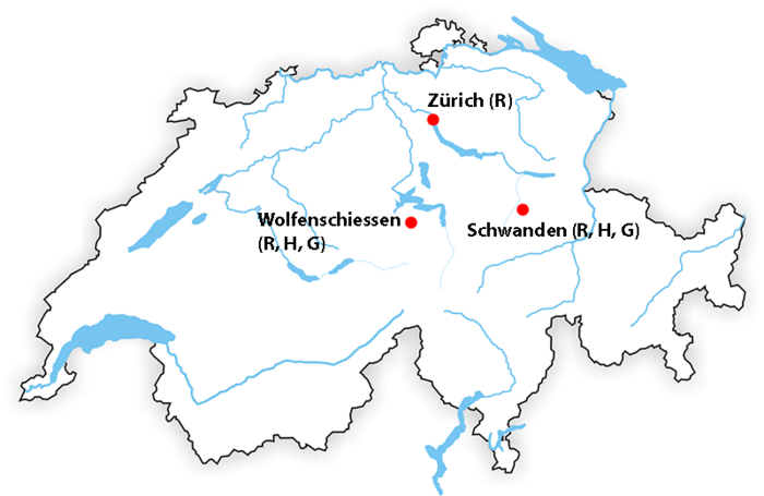Abb. 2 - Lage der Untersuchungsorte mit den vorkommenden Schalenwildarten. R = Reh, H = Hirsch, G = Gämse. Karte: Wikipedia, GNU Free Documentation License