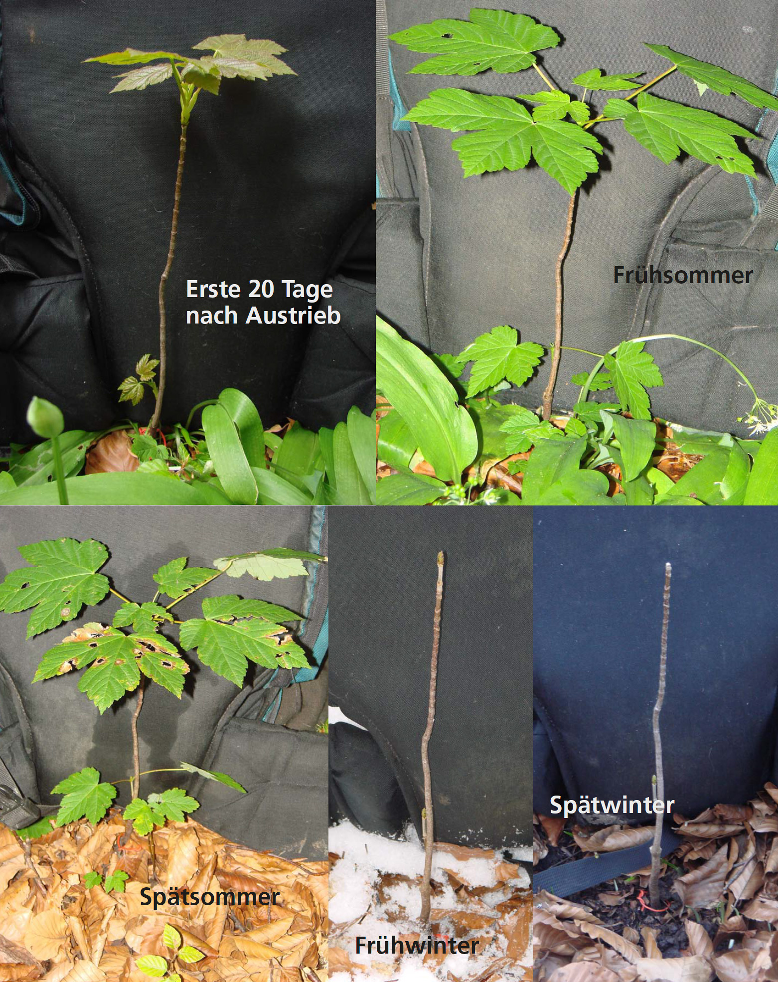Die ausgewählten Jungbäume wurden im Durchschnitt über 3,1 Jahre beobachtet. Einige der Bäume sind in dieser Zeit ausgefallen, andere sind neu hinzugekommen. Wir haben die Bäume mehrere Male pro Jahr aufgesucht und fotografiert. Durch Vergleich der Fotos (Abb. 3 und 4) konnten Art und Zeitpunkt der Verbissereignisse bestimmt werden. Aussagen zur Beliebtheit der verschiedenen Baumarten oder zur Verbisssituation in den Untersuchungsgebieten lässt die gewählte Versuchsanordnung jedoch nicht zu.