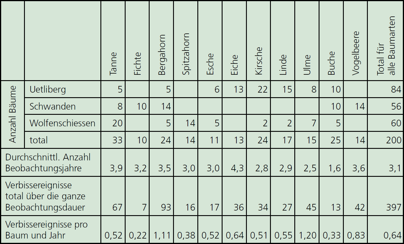 Ulme und Bergahorn wurden in der Beobachtungsdauer am häufigsten verbissen (1,20 bzw. 1,11 Verbissereignisse pro Baum und Jahr), vor Vogelbeere (0,83) und Eiche (0,64). Das ist einerseits auf die Beliebtheit der Baumart als Nahrungspflanze zurückzuführen, andererseits aber auch auf das Untersuchungsgebiet. Die vielen Verbissereignisse bei Bergahorn und Vogelbeere rühren auch daher, dass sich von diesen Baumarten ein grosser Teil der beobachteten Bäume in Schwanden befinden, einem Wildschongebiet mit hohem Wildbestand.