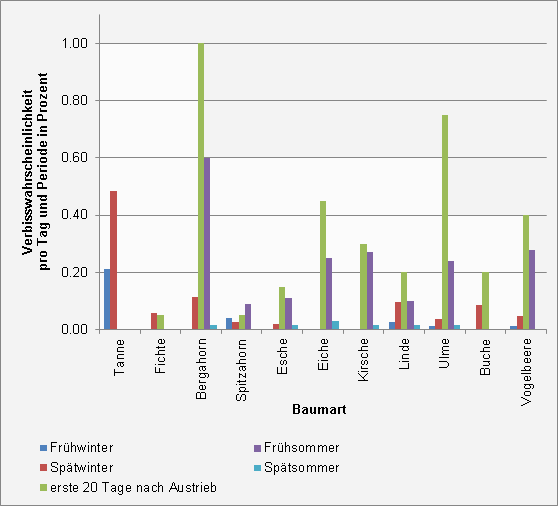 Die Verbisswahrscheinlichkeit pro Tag ist bei den untersuchten Baumarten und in den verschiedenen Perioden sehr unterschiedlich (Abb. 6). Aufgrund des vorliegenden Datenmaterials beträgt beispielsweise das Verbissrisiko beim Bergahorn an jedem der ersten 20 Tage nach dem Austrieb ein Prozent, bei der Tanne liegt es im Sommer dagegen bei Null Prozent.