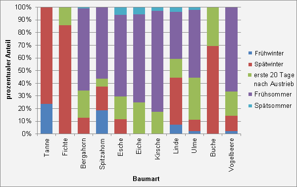 Aufgrund dieser Feststellungen haben wir für die Einordnung der Verbissereignisse fünf Perioden definiert. Die Abgrenzung dieser Perioden erfolgte soweit möglich anhand phänologischer Erscheinungen: Austrieb, Blattfall, Vitalitätsverluste der Blattorgane. Wo sich zur Abgrenzung kein eindeutiges phänologisches Merkmal anbot, wählten wir die Abgrenzung willkürlich, etwa für den Abschluss derjenigen Periode direkt nach dem Austrieb. Für die Trennung des Winters in zwei Hälften wurde durchgehend der 15. Januar gewählt, denn etwa um diese Zeit setzt bei den Bäumen das Wachstum wieder ein.