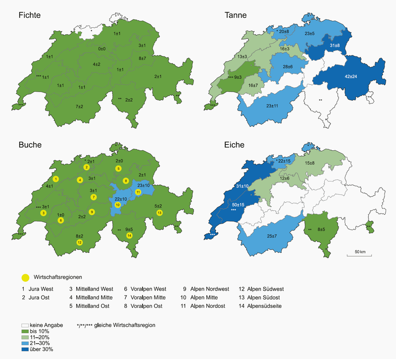 Mit einer landesweiten Verbissintensität von 3% wird bei den Laubbäumen die Buche am wenigsten verbissen. Allerdings ist die Verbissintensität in den Wirtschaftsregionen Alpen Mitte und Alpen Nordost, wo wenig Buchenverjüngung vorhanden ist, mit Werten von 22% und 23% deutlich höher.