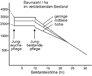 Vorbeugend sollte bei der Bestandesbegründung und Pflege auf den Wuchsraum (x Fichten pro ha bei Schneebruchgefährdung Tab. 1) und auf die Baumzahlleitkurven (Abb. 3) geachtet werden. Ferner wird zu gestaffelter Durchforstung geraten.