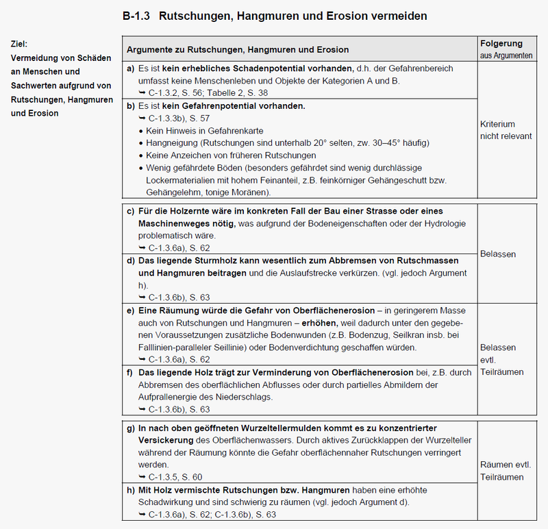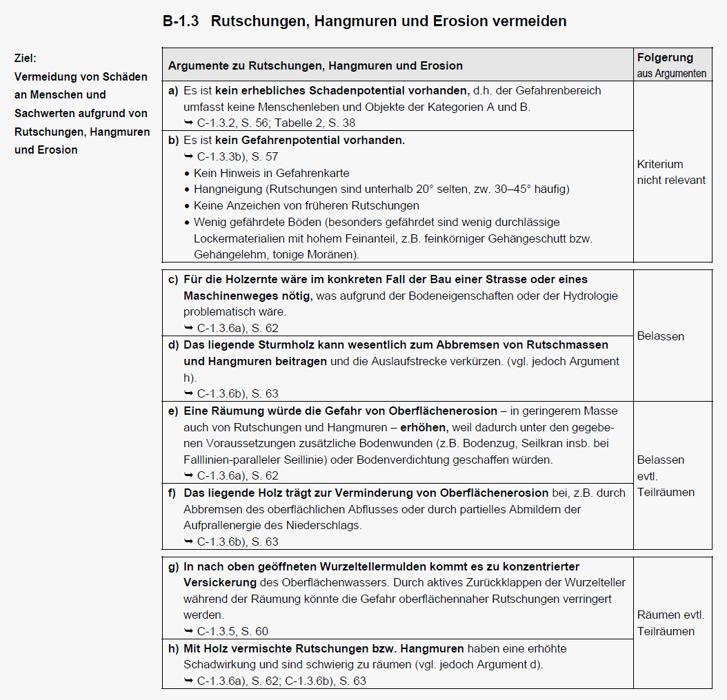 Um die Kriterien aus der Checkliste beurteilen zu können, sind im Teil B der Entscheidungshilfe zu jedem Kriterium die möglichen Argumente zusammengestellt (Abb. 4). Je nach Situation der zu beurteilenden Windwurffläche können die Argumente in unterschiedlicher Zusammensetzung für das Belassen oder für das Räumen des Sturmholzes sprechen. Jedes Argument ist mit einem Kleinbuchstaben identifiziert, der für den Eintrag in die Checkliste bestimmt ist.