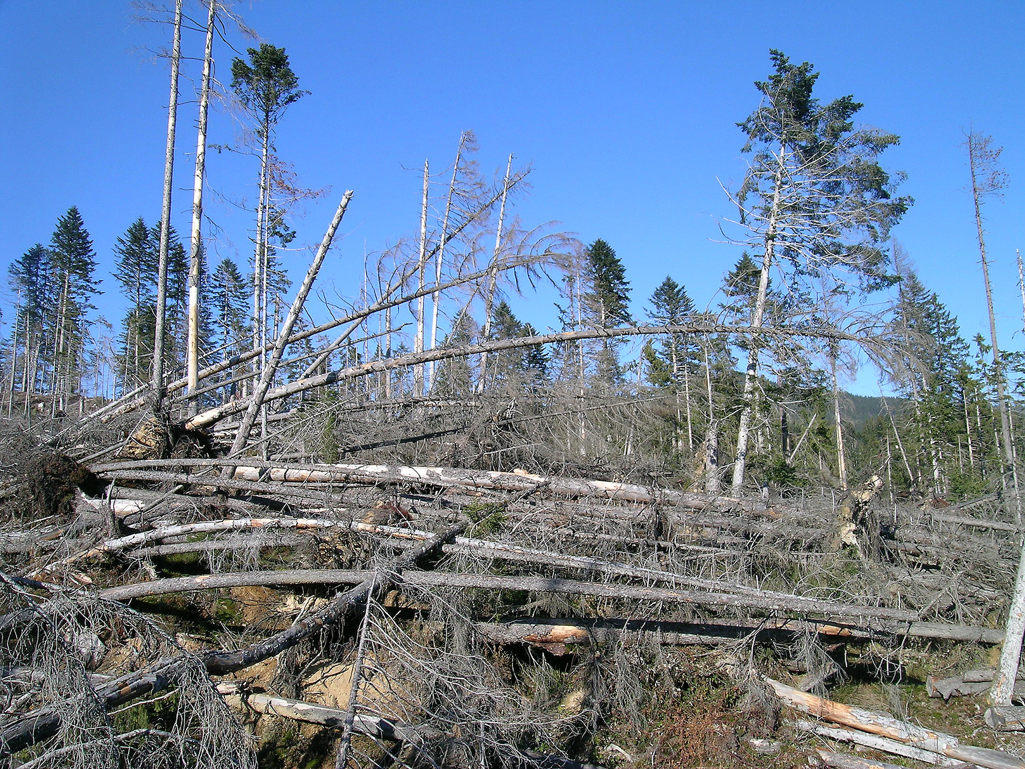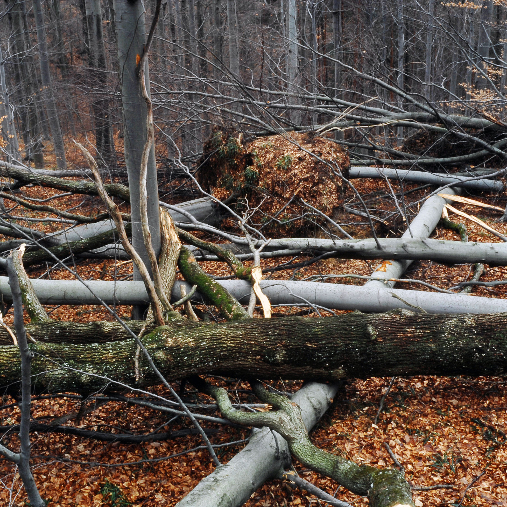 Zweiter Faktor ist die Baumart. Es gibt eben Baumarten, die sind stärker gefährdet. Und da die großflächigen Starkstürme meteorologisch bedingt eigentlich ausschließlich immer im Winter blasen, sind es vor allem die Nadelbäume mit ihren immergrünen Kronen, die dann einfach mehr Wind abbekommen.