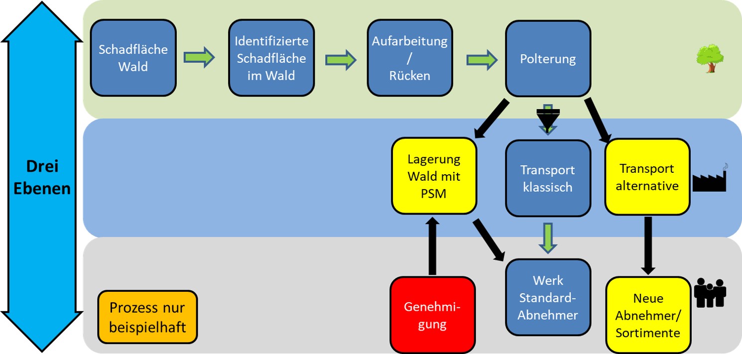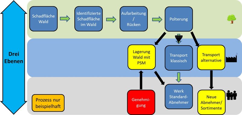 Die Erfahrung mit vergangenen Sturmereignissen zeigt, dass es aufgrund der erhöhten Menge und Frequenz der zu bewältigenden Aufgaben immer wieder zu Problemen in standardmäßigen Prozessabläufen kommt. So kann es regional durchaus vorkommen, dass keine Vermarktung des Holzes mehr möglich ist und Kapazitätsengpässe in Transport und Lagerung entstehen. Dies hat nicht nur zur Folge, dass eine deutlich längere Zeitspanne zur Bewältigung einer Krise benötigt wird, sondern geht damit auch ein ökonomischer und ökologischer Schaden einher. Denn neben den Schäden, die primär durch den Sturm verursacht wurden, gilt es vor allem die Folgeschäden, z. B. durch Käferbefall, so gering wie möglich zu halten.