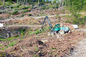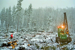 Abb. 1: Aufarbeitung einer "Kyrill"-Fläche im Sauerland mit Harvester. Foto: A. Lange