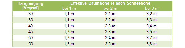 Tab. 1: Effektive Baumhöhe je nach effektiver Schneehöhe und Hangneigung