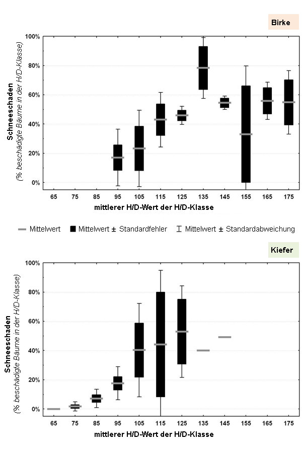 Auf einer jüngeren Kiefern- beziehungsweise Birken-Versuchsfläche der FVA ließ sich die Schadanfälligkeit von Bäumen gegenüber unmittelbar nach der Durchforstung auftretende Nassschneefälle untersuchen: Bei beiden Baumarten nimmt die Anfälligkeit mit steigendem H/D-Wert hoch signifikant zu. Außerdem hatten die Dichte der Bestände zum Zeitpunkt des Schneefalls sowie die Stärke der unmittelbar vorhergehenden Durchforstung einen gewissen Einfluss, der jedoch eindeutig hinter der Wirkung des H/D-Wertes zurück trat.