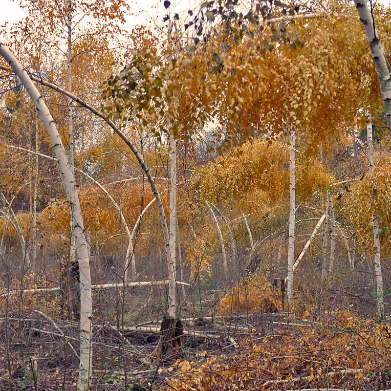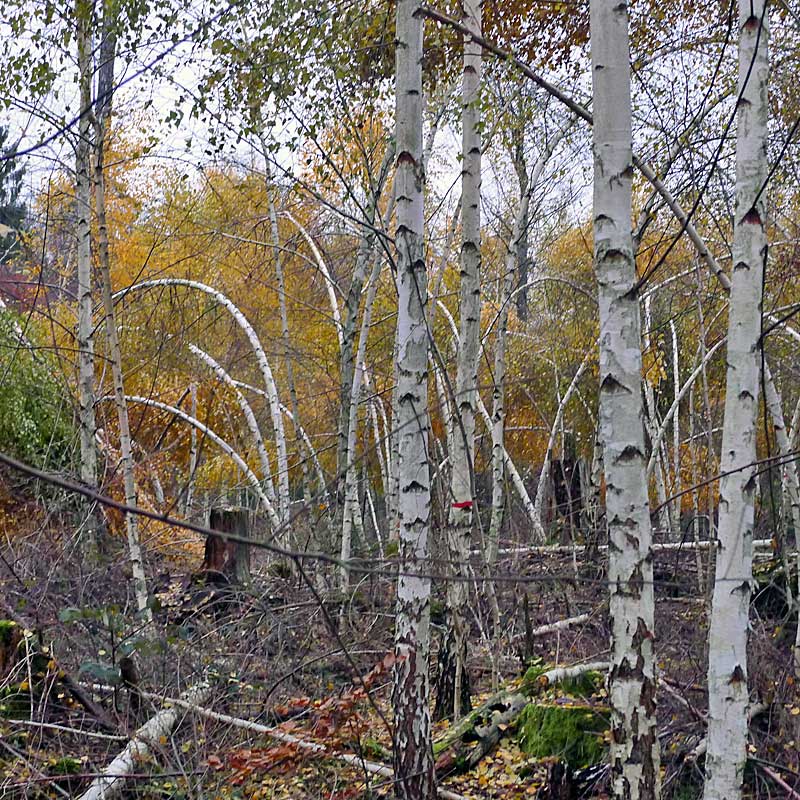 Während die Gefährdung breitkroniger Flachlandkiefern durch Nassschnee seit langem bekannt und dokumentiert ist, erscheinen Schneeschäden an einer Laubbaumart wie der Birke zunächst erstaunlich. Sie werden jedoch zum einen durch den frühen Zeitpunkt des Schneefalls erklärlich, als die Laubverfärbung eben erst eingesetzt hatte (Abb. 1, 2). Zum anderen sind Schneeschäden bei Birke tatsächlich ein durchaus bekannter Risikofaktor.