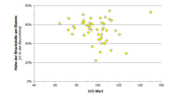 Anhand der verfügbaren Messungen konnte bei den gebrochenen Kiefern auch geprüft werden, inwieweit der H/D-Wert mit der Höhe der Bruchstelle am Stamm zusammenhängt. Abb. 4 zeigt die relative Länge des nach einem Bruch verbliebenen Stammstücks in Abhängigkeit des H/D-Werts der jeweiligen Kiefer. Nach der Darstellung scheint zwar die Höhe der Bruchstelle am Stamm tendenziell mit sinkendem H/D-Wert zu steigen. Allerdings ist die Streuung der Werte so groß, dass sich auf der Basis des verfügbaren Datenmaterials kein statistisch gesicherter Zusammenhang ableiten lässt.