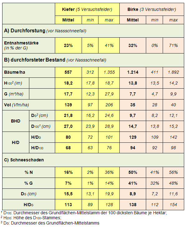 Bezüglich Schneeschäden war es vor kurzem wieder einmal so weit. Zwei Nassschneeereignisse führten im März 2006 in einer Kiefern-Versuchsfläche der FVA nahe Freiburg und wenige Jahre später im Oktober 2012 in einer Birken-Versuchsfläche nahe Stuttgart zu erheblichen Schäden. Beide Flächen waren jeweils unmittelbar vor den Schneefällen im Rahmen ihres Versuchsprogramms durchforstet worden. Nach Erfassung der vom Schnee beschädigten Bäume unmittelbar nach dem Schadereignis ergab sich dadurch die Möglichkeit, möglichen Zusammenhängen zwischen den aufgetretenen Schäden, der Behandlung sowie der Entwicklung von Beständen und Bäumen quantitativ nachzugehen.
